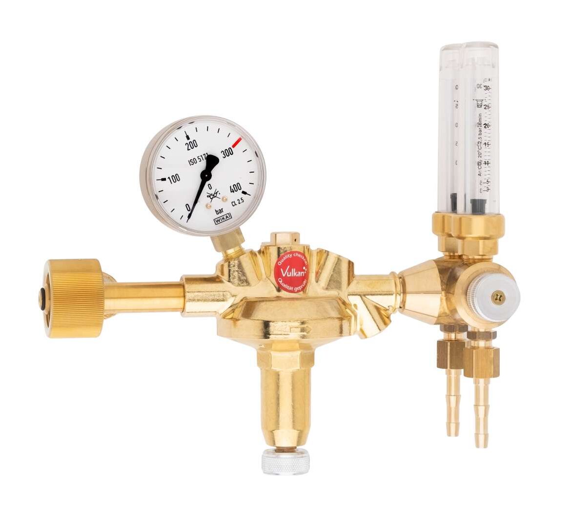 Vulkan F15/200 2F Effect 2 cylinder pressure reducer with flowmeter H2 3-32 Nl/min. 4.5 bar according to ISO 2503, Class 20. Single-stage design with two flowmeters for monitoring the exact flow rate in Nl/min. With pre-pressure compensation for constant back pressure when the pre-pressure drops. With safety pressure gauge according to ISO 5171 and shut-off valve. Maximum inlet pressure: 200 bar. Outlet pressure: 2 x 4.5 bar, fixed output. Output: 2 x 3.0 - 32.0 Nl/min. Hydrogen adjustable. Inlet: W21.8x1/14LH U-nut according to DIN 477-1, No. 1. Outlet: 2x G 3/8LHk x 9mm nozzle according to DIN EN 560. Inlet pressure gauge: 0 - 315 / 200 bar. Width x Height x Depth: 210 x 230 x 75 mm. Gas purity/membrane: Standard: - for technical gases up to a gas purity of 4.5 with a standard membrane. Optional (surcharge): - for pure gases up to a gas purity of 5.0 with a stainless steel membrane SS321 (1.4541).