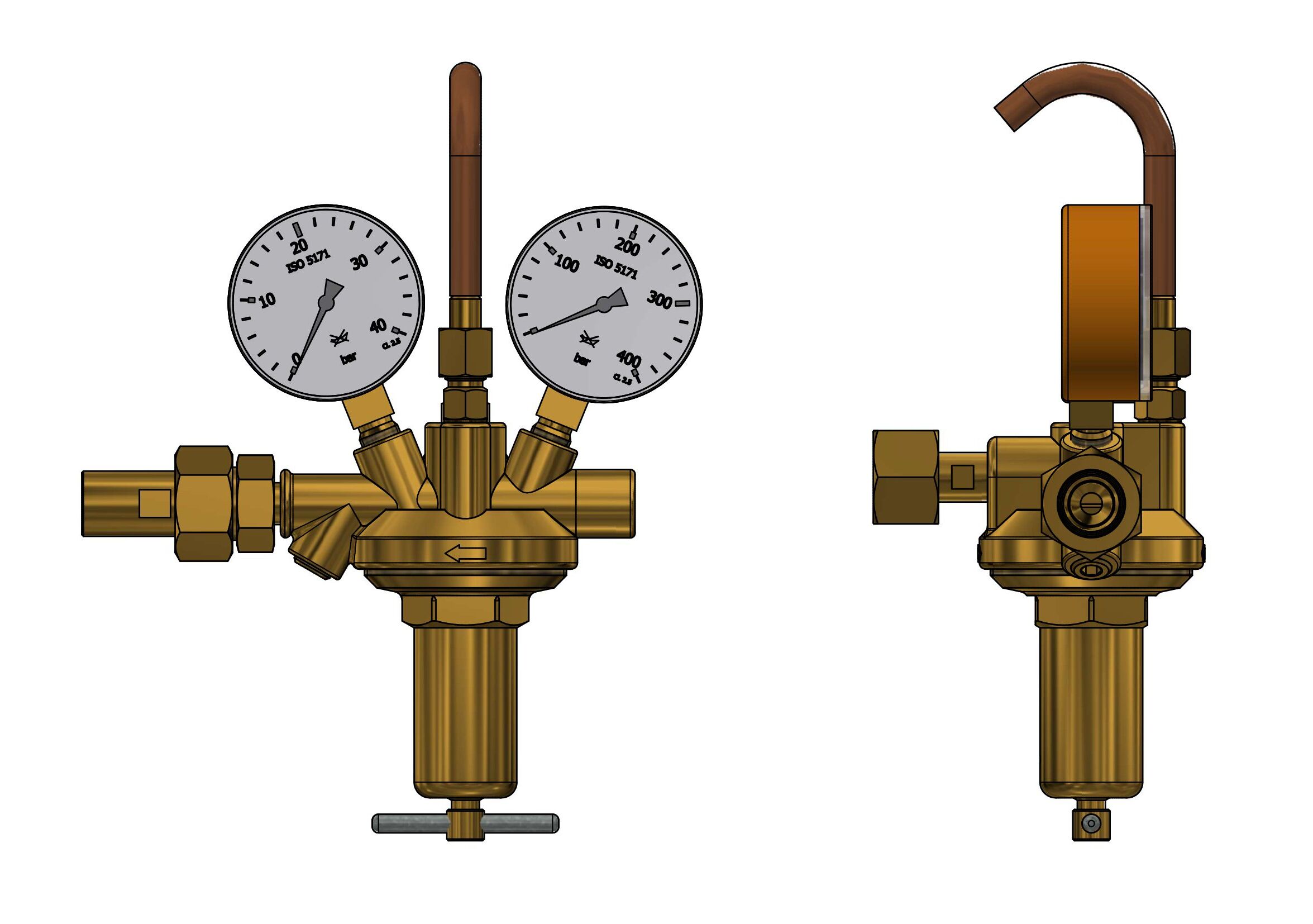 free of oil- and grease, acc. to ISO 7291, with metal diaphragm, single stage, with safety gauges acc. to ISO 5171inlet pressure max: 100 bar