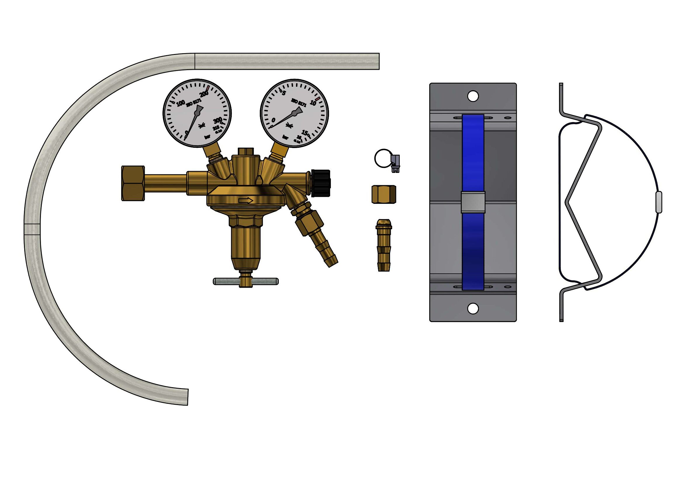 with metal diaphragm, 5m hose #400 206 01, 2 hose clamp VA #400 223, 1 tail piece #402 003, 1 nut #402 021, 1 cylinder rack #410 040 01, complete blistered with label "free of oil and grease" with operating manual Linde in box