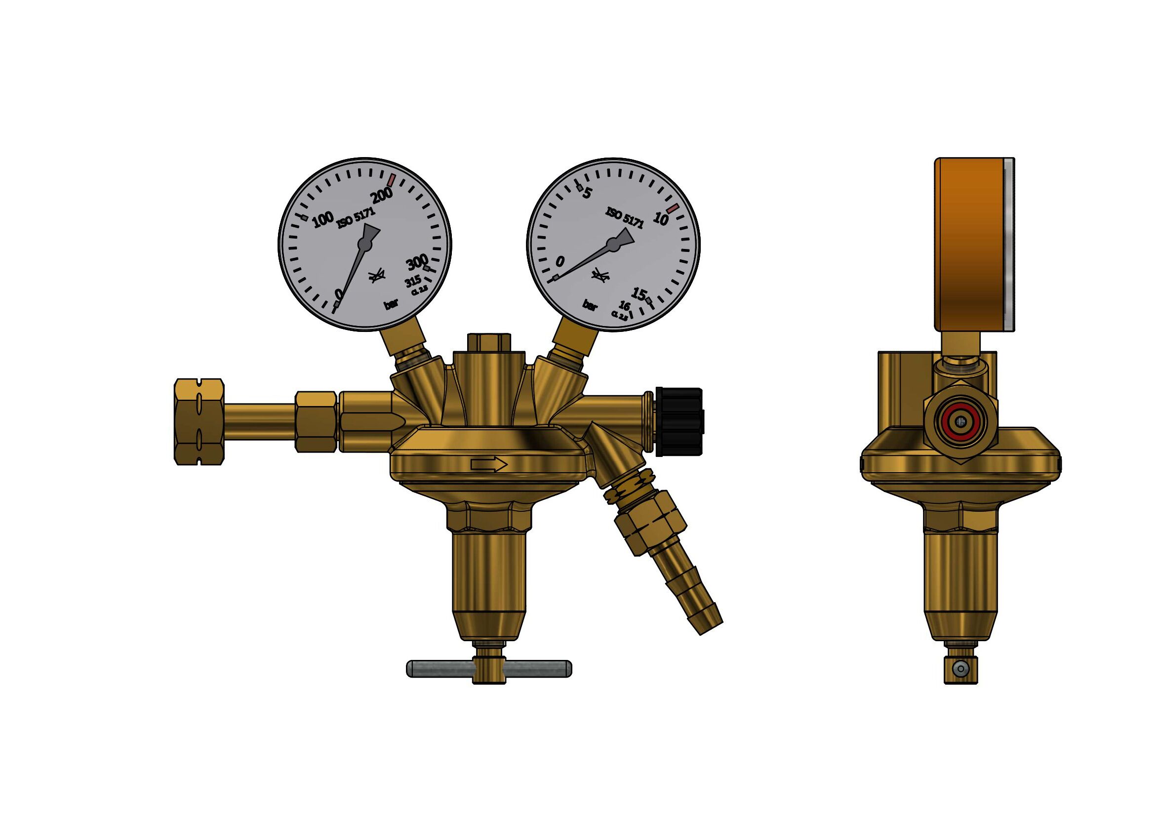acc. to ISO 2503, class 3, single stage, with safety gauges acc. to ISO 5171, with shut off valve,inlet pressure max.: 200 bar