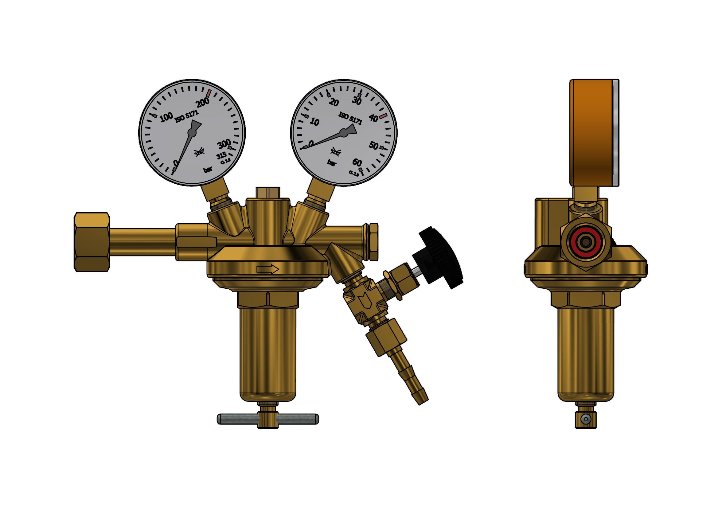 acc to DIN EN ISO 2503, single stage, with high pressure compensation for a constant working pressure on falling inlet pressure with safety gauges acc. to DIN ISO 5171inlet pressure max: 200 bar