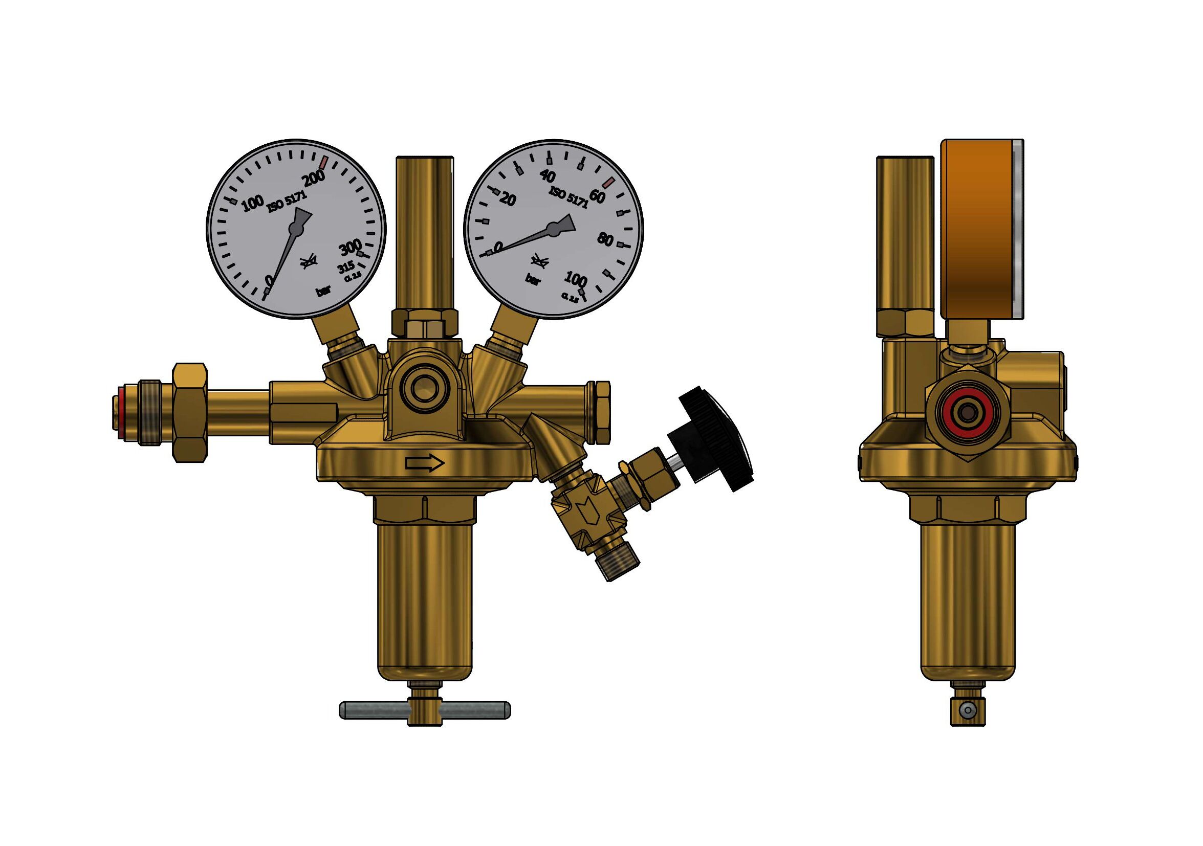 acc to DIN EN ISO 2503, single stage, with high pressure compensation for a constant working pressure on falling inlet pressure with safety gauges acc. to DIN ISO 5171inlet pressure max:200 bar