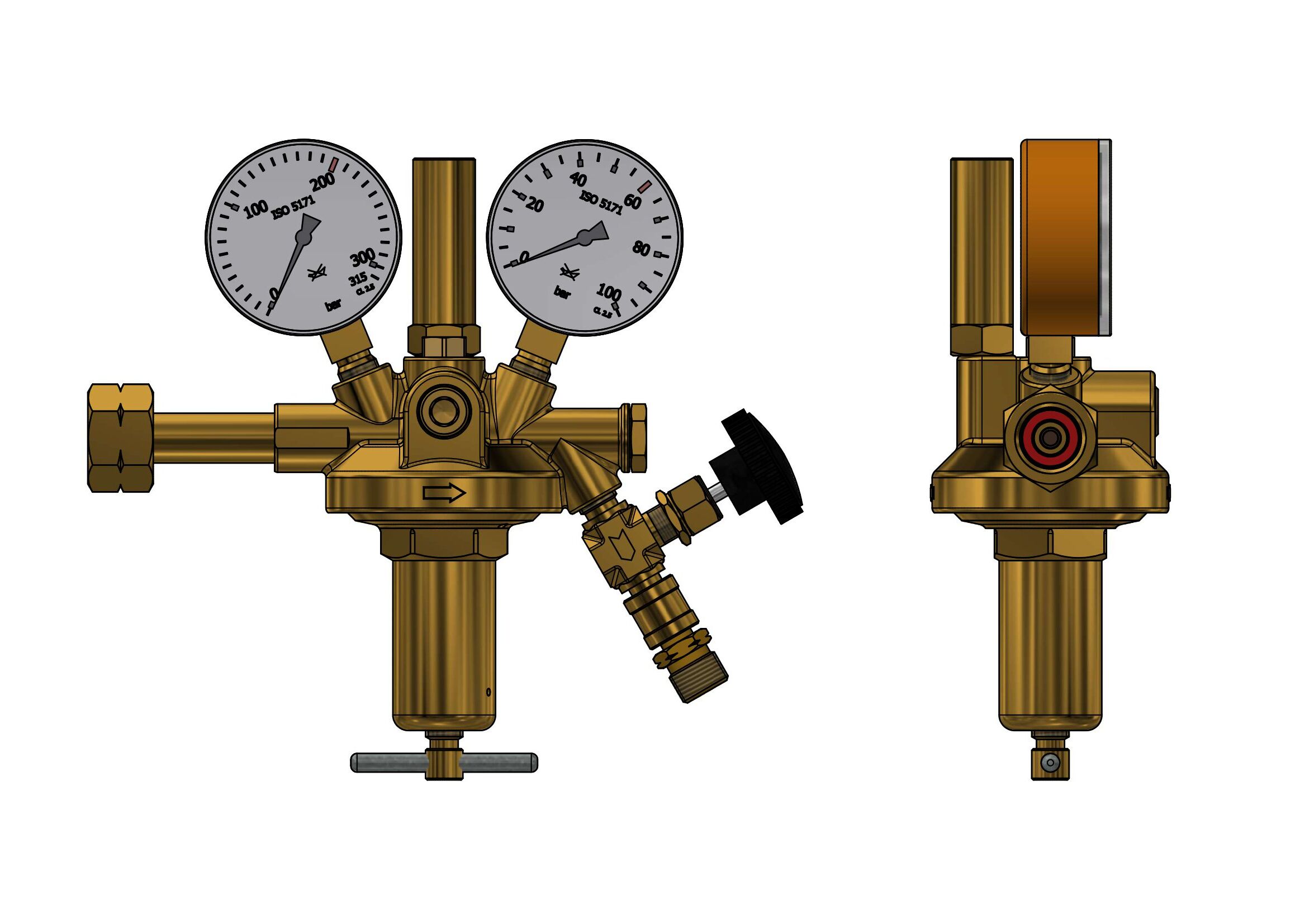 acc to DIN EN ISO 2503, single stage, with high pressure compensation for a constant working pressure on falling inlet pressure with safety gauges acc. to DIN ISO 5171inlet pressure max:200 bar