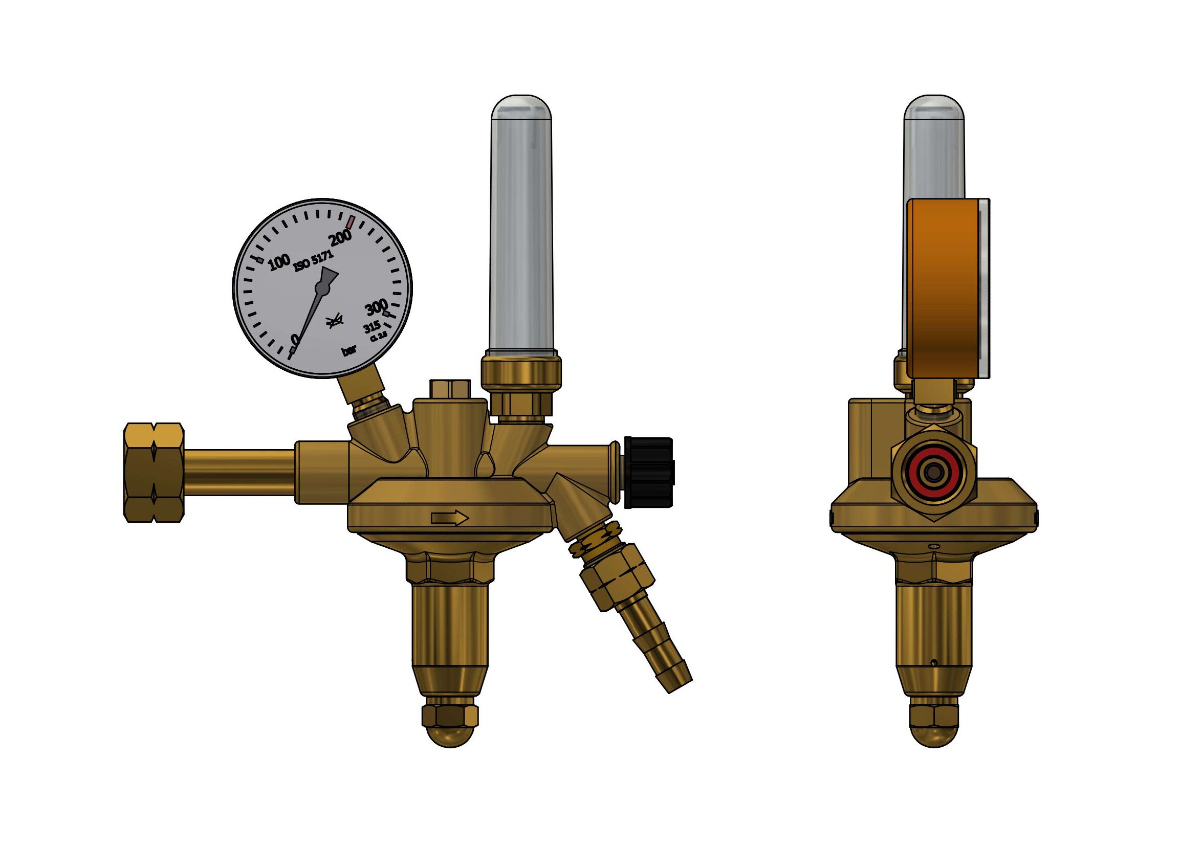 acc to DIN EN ISO 2503, class 10, single stage with flowmeter, with high pressure compensation for a constant working pressure on falling inlet pressure with safety gauges acc. to DIN ISO 5171inlet pressure max: 200 bar