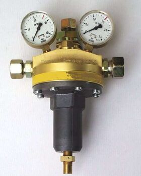 single-stage design, with shut-off valve, with safety gauges according to DIN EN ISO 5171, maximum inlet pressure: 200 bar, adjustable outlet pressure: 0-1