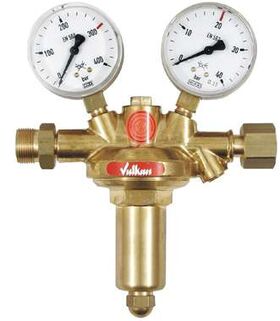 Main pressure reducer Vulkan H20/200 Effect nitrogen right for AM 35H-20 bar according to DIN EN ISO 7291, single-stage design, burnout tested according to ISO 7291, with pre-pressure compensation for constant back pressure with falling pre-pressure, with safety pressure gauges according to DIN ISO 5171. Maximum inlet pressure: 200 bar. Output pressure: 20 bar fixed. Maximum output: 75 Nm?/h at 20 bar back pressure. Inlet: external thread M24x1.5RHak-16S, Outlet: union nut G1/2RHk according to DIN EN 560. Inlet pressure gauge: 0 - 315 / 200 bar. Outlet pressure gauge: 0 - 40 / 20 bar. Width x Height x Depth: 210 x 190 x 75 mm. *****NOTE***** Replacement pressure reducer for automatic changeover group AM35/AM35H (20 bar fixed) This pressure reducer does NOT fit directly onto a cylinder bundle on the connection side! Please specify the system number when ordering! This main pressure reducer is available in the following versions, among others: Gas purity/diaphragm: Standard: - for technical gases up to a purity of 4.5 with a standard diaphragm. Optional (surcharge): - for pure gases up to a purity of 5.0 with a stainless steel diaphragm SS321 (1.4541).