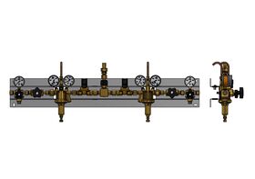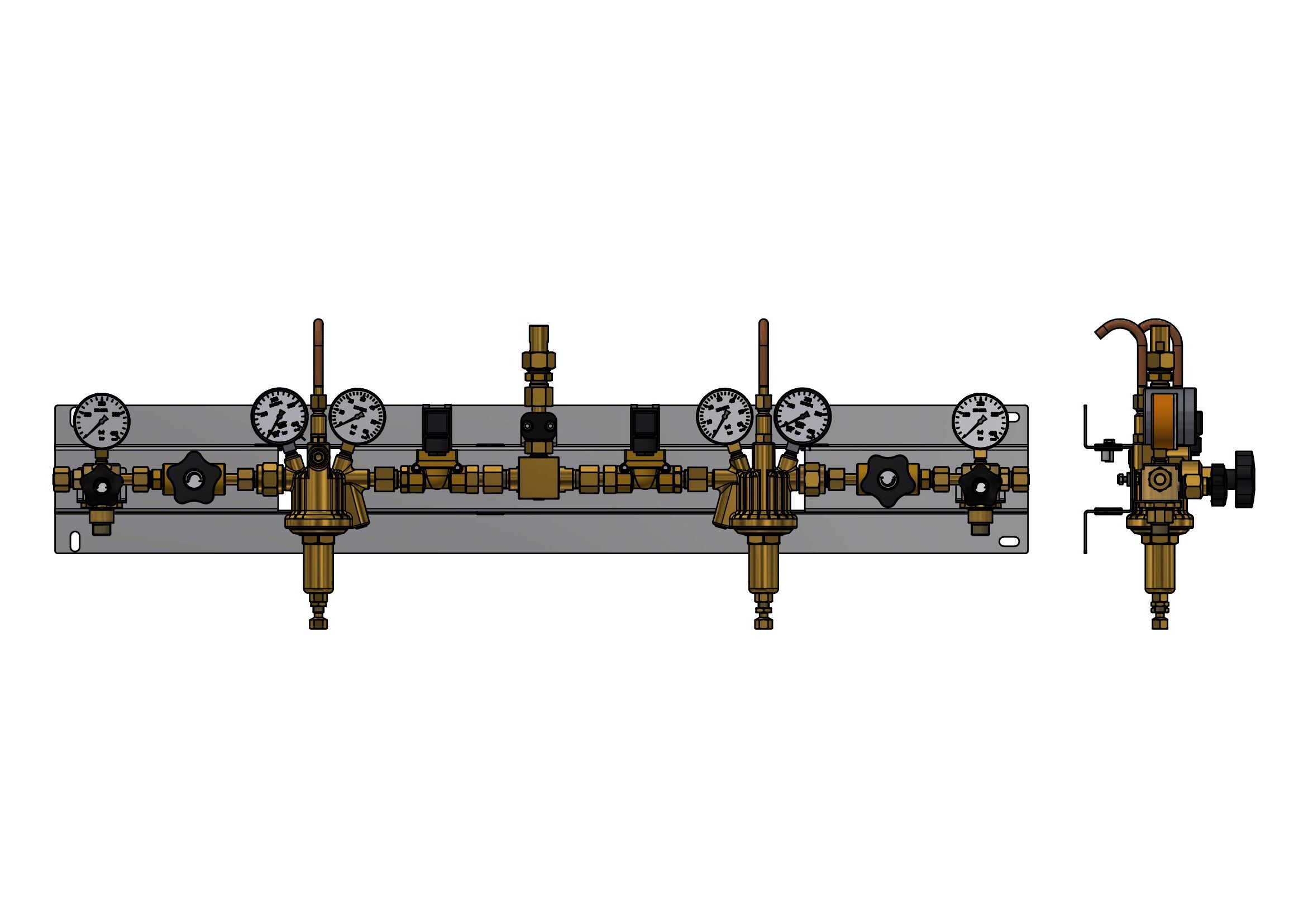 free of oil- and grease, for oxygen use, consisting of: 2 HP shut-off valve, 2 pressure regulator HR40 acc. to ISO 7291, adiabatic compression tested acc. to ISO 7291 single stage, with metal diaphragm and HP-contact gauges with inductive-contact (NO), 2 solenoid valves 230VAC, 1 double non return valve and 2 distribution blocks, each with an input with sintered filter, non-return valve, connection for a safety valve, purge valve and high-pressure gauge and connection for a cylinder/bundle manifold module, completely mounted on stainless steel base plate