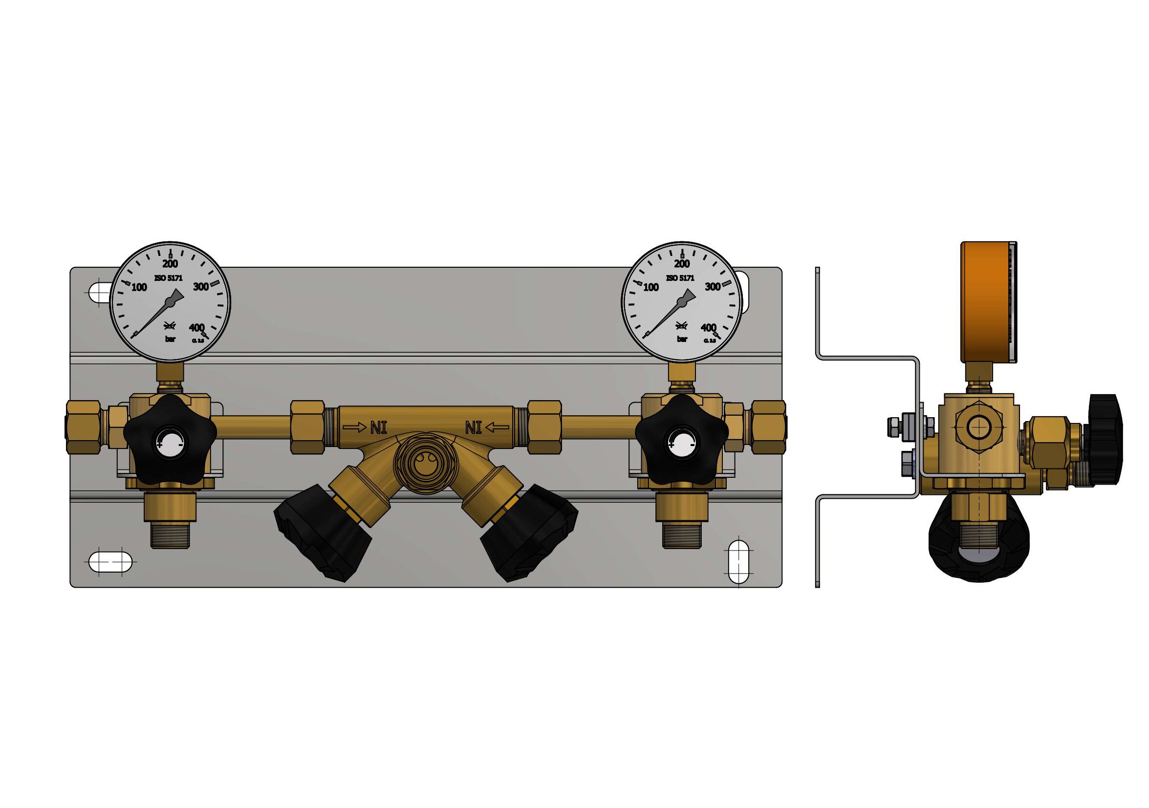 2 distribution blocks, each with an input with sintered filter, non-return valve, purge valve and high-pressure gauge and connection for a cylinder/bundle manifold module, completely mounted on stainless steel base plate,
