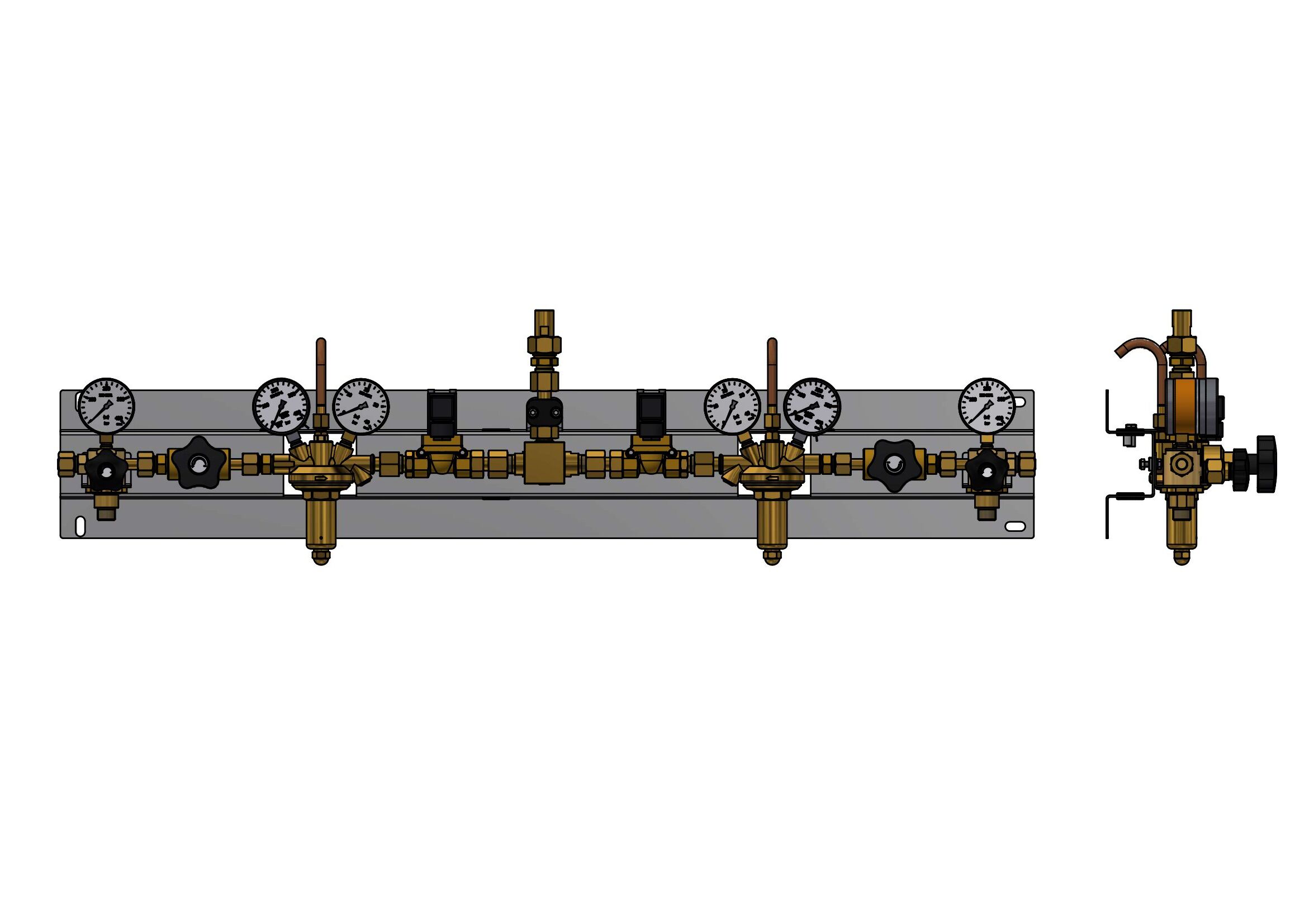 Automatic manifold Vulkan 300 bar Linde free of oil- and grease, for oxygen,consisting of: 2 HP shut-off valve, 2 pressure regulator H20 acc to ISO 7291, single stage, adiabatic compression tested acc. to ISO7291, with metal diaphragm and HP-contact gauges with inductive-contact (NO), 2 solenoid valves 230VAC, 1 double non return valve and 2 distribution blocks, each with an input with sintered filter, non-return valve, purge valve and high-pressure gauge and connection for a cylinder/bundle manifold module, completely mounted on stainless steel base plate