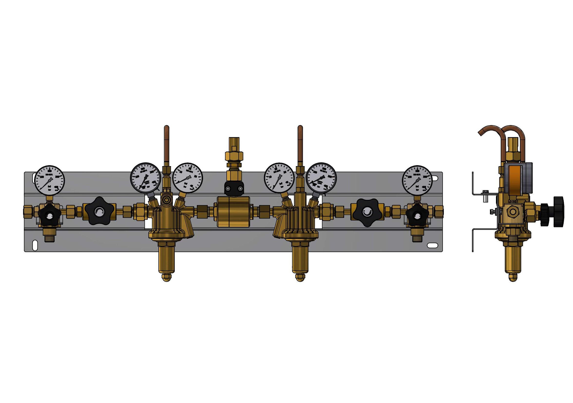 free of oil- and grease, for inert gas, fuel gas and oxygen, BAM - approved,consisting of: 2 HP double shut-off valve, 2 pressure regulator HR 20 acc. to ISO 7291, BAM - approved with membrabe and HP-contact gauges with inductive-contact, in Ruhestellung geöffnet, bei steigendem Druck schließend, incl. 2 Meter langem, 2 pol. Anschlußkabel, Farbe "blau", Abblaseventile mit montiertem Cu-Rohrbogen (270°, 10x1 mm), 1 change over block and 2 distribution blocks, each with an input with sintered filter, non-return valve, purge valve and high-pressure gauge and connection for a cylinder/bundle manifold module, completely mounted on stainless steel base plate