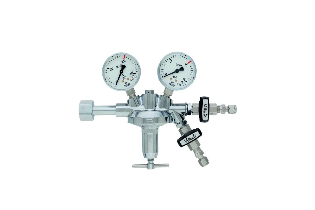 Vulkan F10/200 Effect LabLine LG CO2/Argon cylinder pressure reducer DIN 477-1. Completely chrome-plated with metal diaphragms for gas purity 5.0