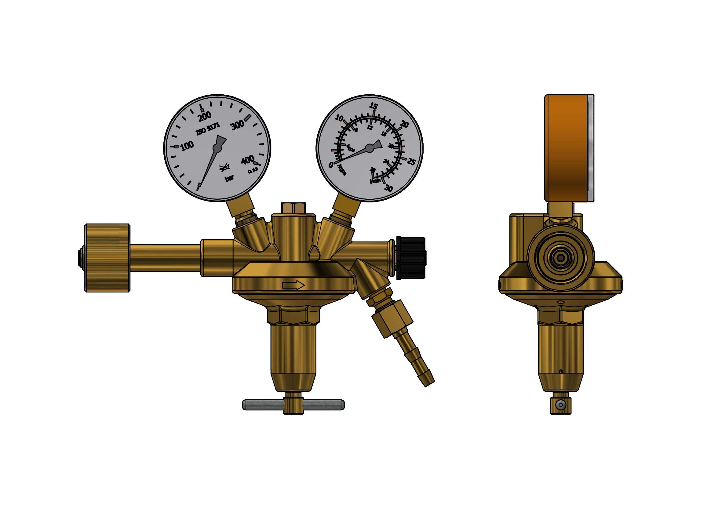 acc to DIN EN ISO 2503, class 3, single stage, with safety gauges acc. to DIN ISO 5171, with shut off valve,inlet pressure max: 300 bar