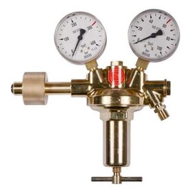 Compact two-stage cylinder pressure regulator type Sigma II in accordance with ISO 2503 for technical, medical, corrosive, laboratory and high-purity gases. Compact design and high regulation accuracy. Absolutely constant downstream pressure at decreasing cylinder pressure due to two regulation stages. Right-hand inlet: cylinder connection per DIN 477 Part 1 or Part 5; outlet: compression fitting, alternatively 1/4" NPT-F thread. Upstream and downstream pressure gauges Ø 50 mm to DIN 837. 50 µm inlet filter. One blow-off valve per stage. Max gas purity 6.0; max inlet pressure up to 300 bar (depending on standard); control ranges from 1.5 bar to 30 bar (special ranges up to 60 bar available); temperature range -40 °C to +70 °C; body materials: chrome-plated brass, stainless steel or Monel; diaphragms: stainless steel or Hastelloy; ECD compatible; leak rate < 1 x 10^-8 (He); ATEX and PED compliant.